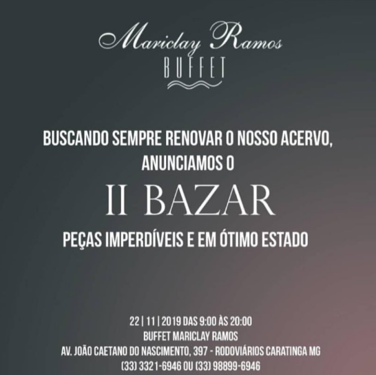 Fiquem ligados! Dia 22 de novembro, sexta-feira, vai rolar a 2ª edição do Bazar do Buffet Mariclay Ramos, peças lindas e em ótimo estado de conservação estarão disponíveis com ótimos preços. O evento vai acontecer das 09h às 20h e outras informações pelo telefone 33216946.