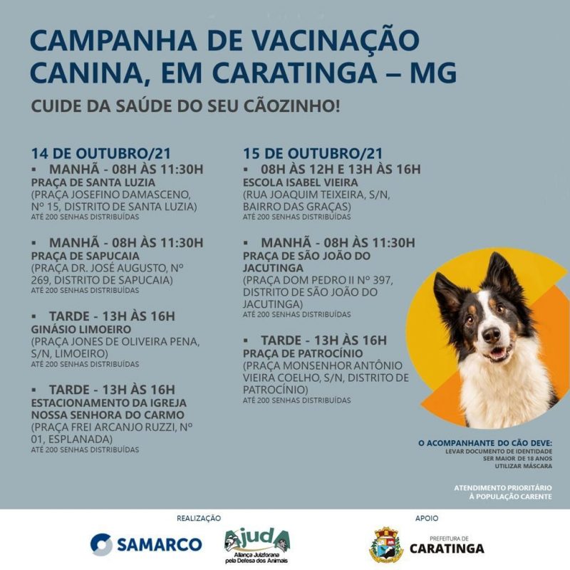 Tendo em vista a alta adesão à Campanha de Vacinação Canina em Caratinga, a Samarco e a ONG Ajuda (Aliança Juizforana pela Defesa dos Animais), com o apoio da Prefeitura de Caratinga, darão continuidade ao projeto no município nos dias 14 e 15 de outubro.