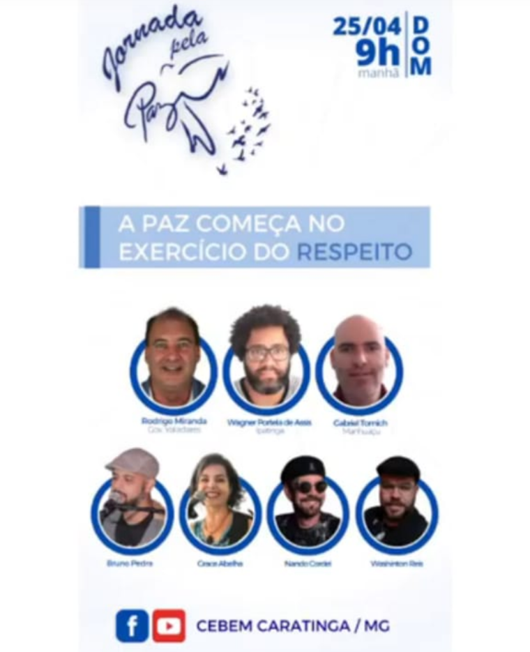 O Grupo Espirita Bezerra de Menezes que desenvolve um dinâmico trabalho de oração e acolhimento em Caratinga, promove no dia 25 de abril, domingo, a partir das 09h o evento online “Jornada Pela Paz” no canal do CEBEM Caratinga no youtube. Neste ano de tantas incertezas e medos, mais acima de tudo de muita esperança teremos uma palavra amiga e motivadora pelos palestrantes: Rodrigo Miranda de Governador Valadares, Wagner Portela de Ipatinga e Gabriel Tomich de Manhuaçu. A parte musical com participação de Graça Abelha, Bruno Pedra, Wando Cordel e Washington Reis. Juntos pela busca de dias melhores!