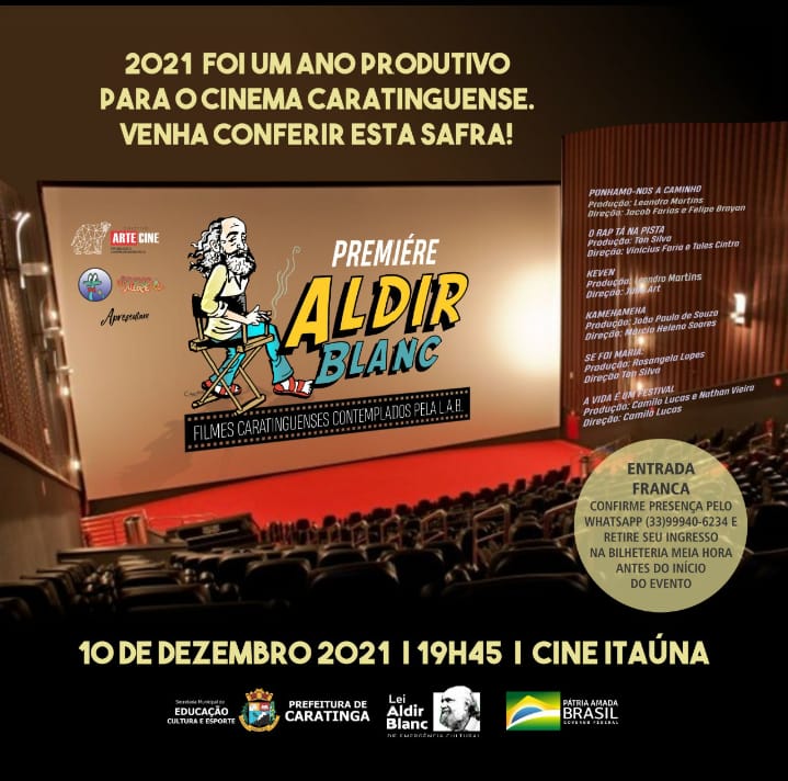 Apresentado pelo Coletivo Arte Cine e Jararaca Alegre, o evento promoverá a exibição de seis filmes caratinguenses produzidos ao longo de 2021, graças à lei Aldir Blanc, disponibilizados aos proponentes através de edital municipal. As produções movimentaram o setor audiovisual local. Os profissionais envolvidos (elenco e equipe técnica) somaram um contingente de dezenas de pessoas, direta ou indiretamente. A Première será um momento muito importante para os diretores, atores, técnicos e colaboradores, que terão a oportunidade de avaliar a qualidade dos produtos e a receptividade do público convidado. Na ocasião, os convidados poderão apreciar uma animação, dois documentários e três obras de ficção. Se você quiser compartilhar conosco este momento, confirme sua presença pelo whatsapp (33) 99940-6234 e retire seu ingresso na bilheteria do Cine Itaúna meia hora antes do inicio do evento!